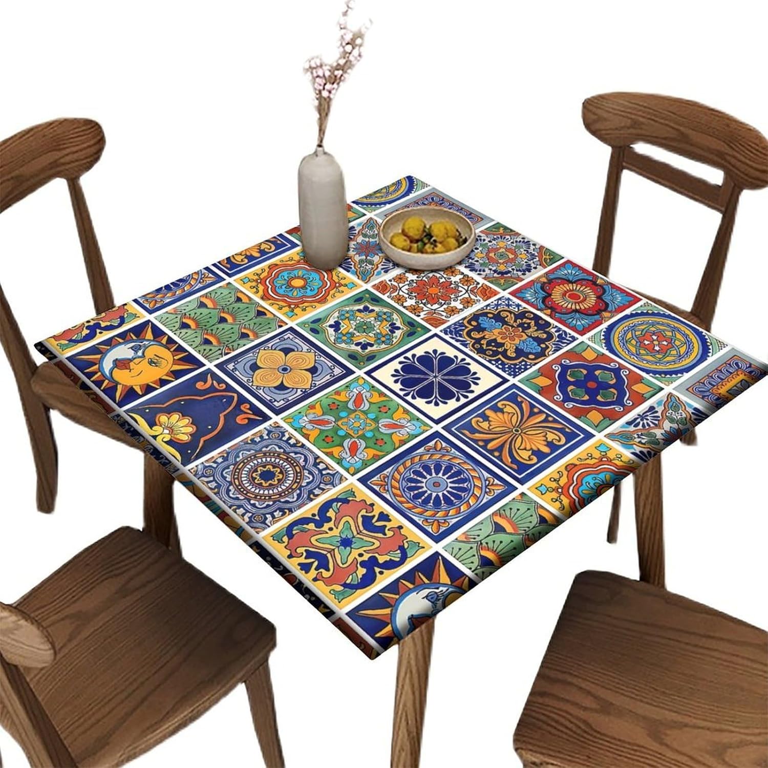 Elastic Edge Square Fitted Tablecloth, Colorful Tiled Pattern Pattern Printed on Elastic Polyester Table Cover, for Dinner Terrace Party,54" x 54"