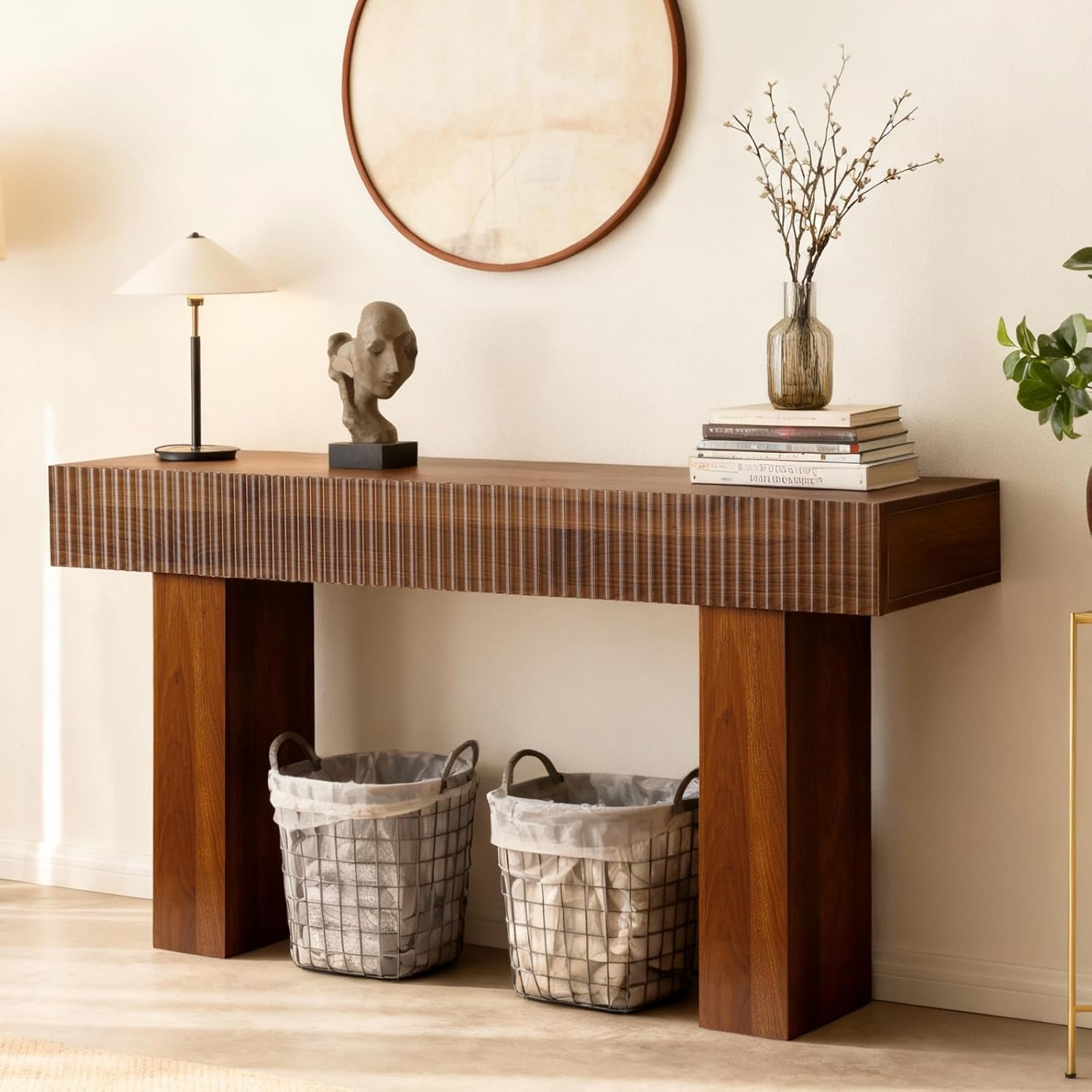 A long console table with fluted decoration is an elegant and stylish furniture piece, often used in entryways, hallways, or living rooms to add both functionality and aesthetic appeal. The table with 48" long, slim profile perfect for narrow spaces. The 11.8" depth is shallow to allow it to fit comfortably along walls without taking up too much space. Made from high-quality wood, to bring out the natural grain. The sofa table with fluted decoration, drawing attention to its craftsmanship and providing a textured contrast to smooth surfaces. In sum, a long console table with fluted decoration is a refined piece, perfect for enhancing the elegance of any space, combining functional utility with beautiful, timeless design details.