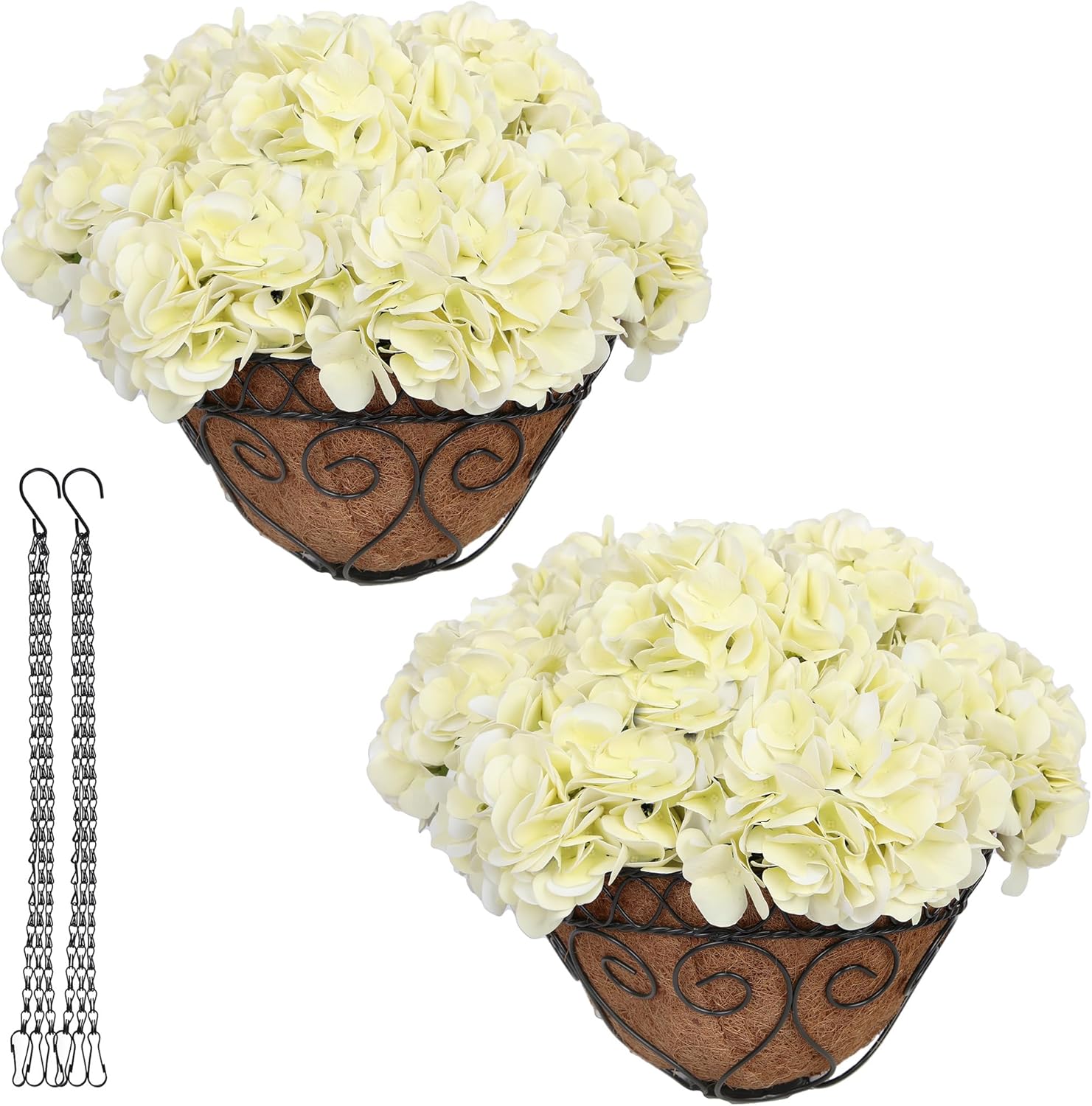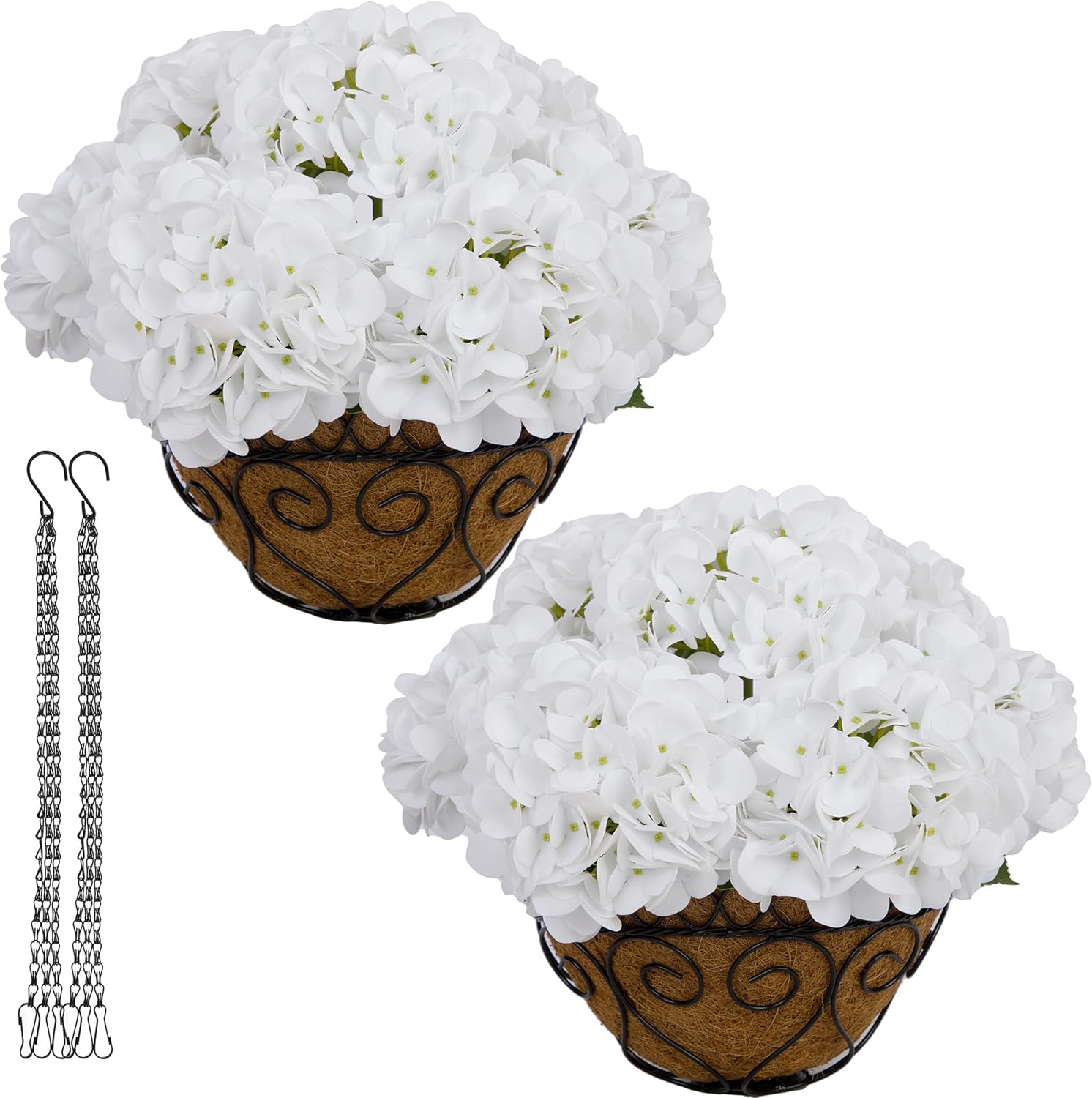 • 【Product Listing】This elegant iron hanging basket hydrangeas set includes a coconut liner, an 11-inch iron hanging basket, a hanging chain, and faux hydrangea flowers. Everything you need to create stunning floral décor—right out of the box.