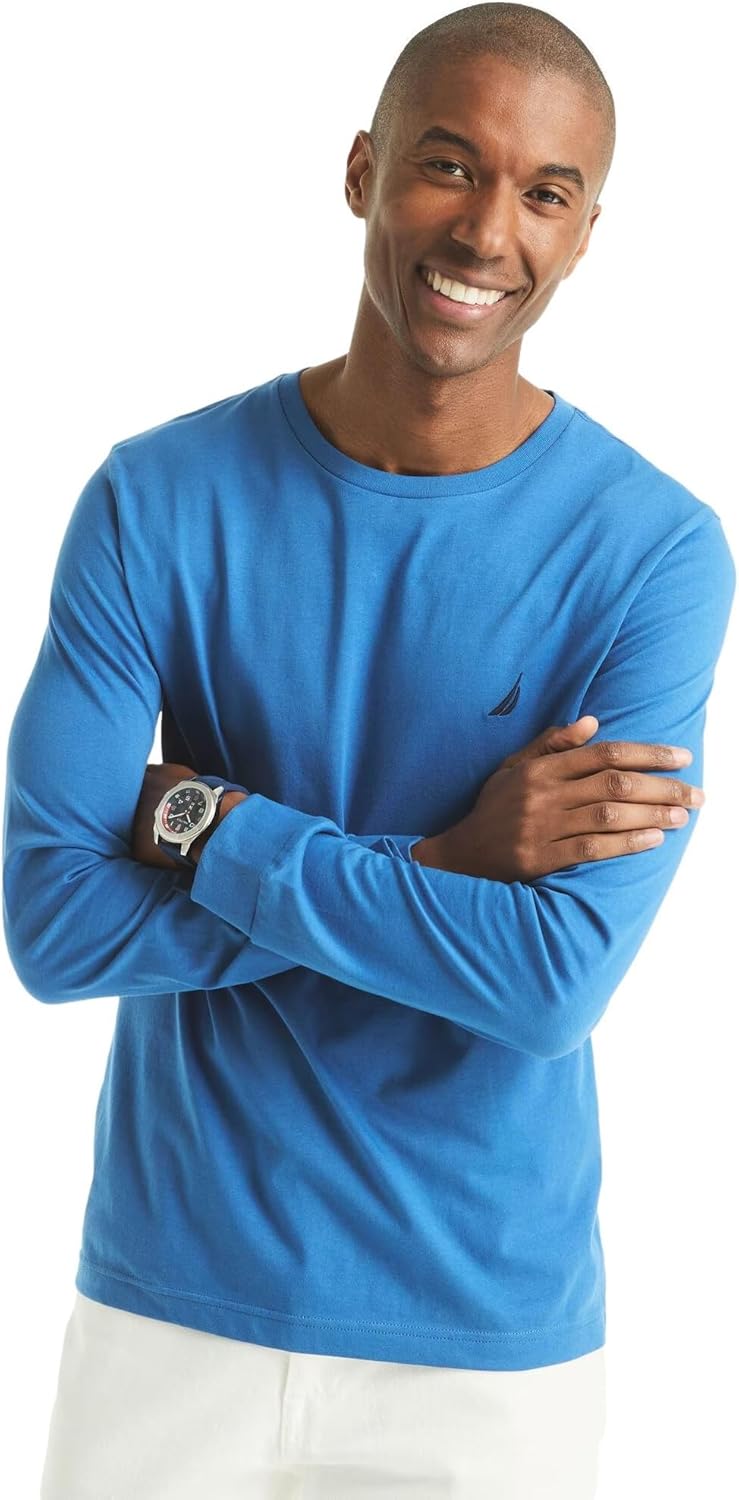 Be cool while staying warm in this soft cotton-jersey long sleeve t-shirt, featuring a ribbed collar and Nautica's signature J-class logo.